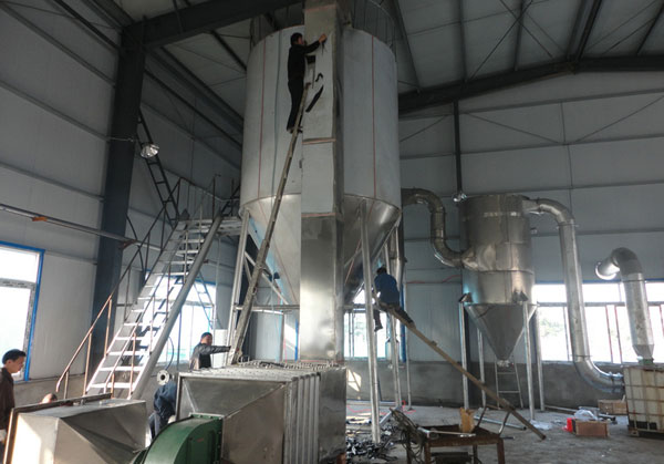 空氣經過濾和加熱,進入干燥器頂部空氣分配器,熱空氣呈螺旋狀均勻地進入干燥室。料液經塔體頂部的高速離心霧化器,(旋轉)噴霧成極細微的霧狀液珠,與熱空氣并流接觸在極短的時間內可干燥為成品。成品連續地由干燥塔底部和旋風分離器中輸出,廢氣由風機排空。