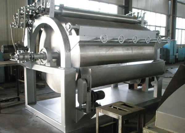 滾筒干燥機(jī)是一種內(nèi)加熱傳導(dǎo)型轉(zhuǎn)動(dòng)連續(xù)干燥設(shè)備。旋轉(zhuǎn)的滾筒通過(guò)其下部料槽,粘附著一厚度的料膜,熱量通過(guò)管道輸送至滾筒內(nèi)壁,傳導(dǎo)到滾筒外壁,再傳導(dǎo)給料膜,使料膜中的濕得到蒸發(fā)、脫濕、使含濕分的物料得到干燥。干燥好的物料被裝置在滾筒表面的刮刀鏟離滾筒,到置于刮刀下方的螺旋輸送器,通過(guò)螺旋輸送器將干物料集中、包裝。